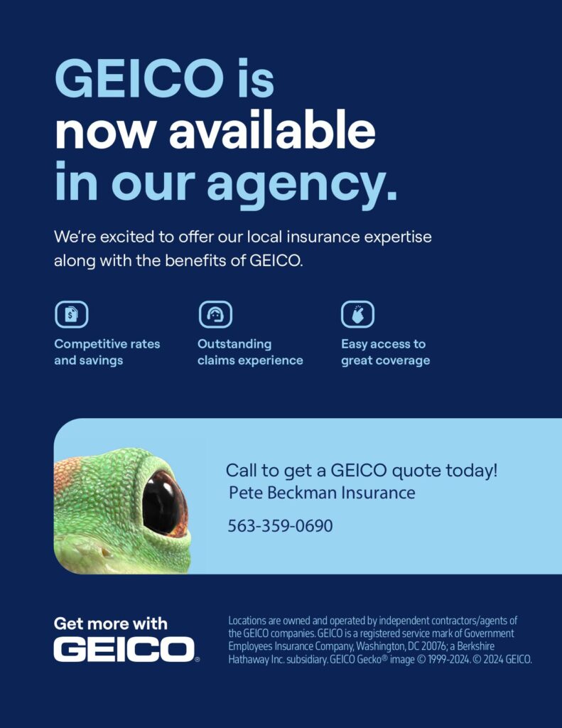 GeicoPosted in Pete Beckman News on October 30, 2024 FacebookXLinkedIn We are thrilled to add Geico as one of our carries! Currently, it is only available for Illinois clients, but Iowa is coming soon. Call us for a quote!